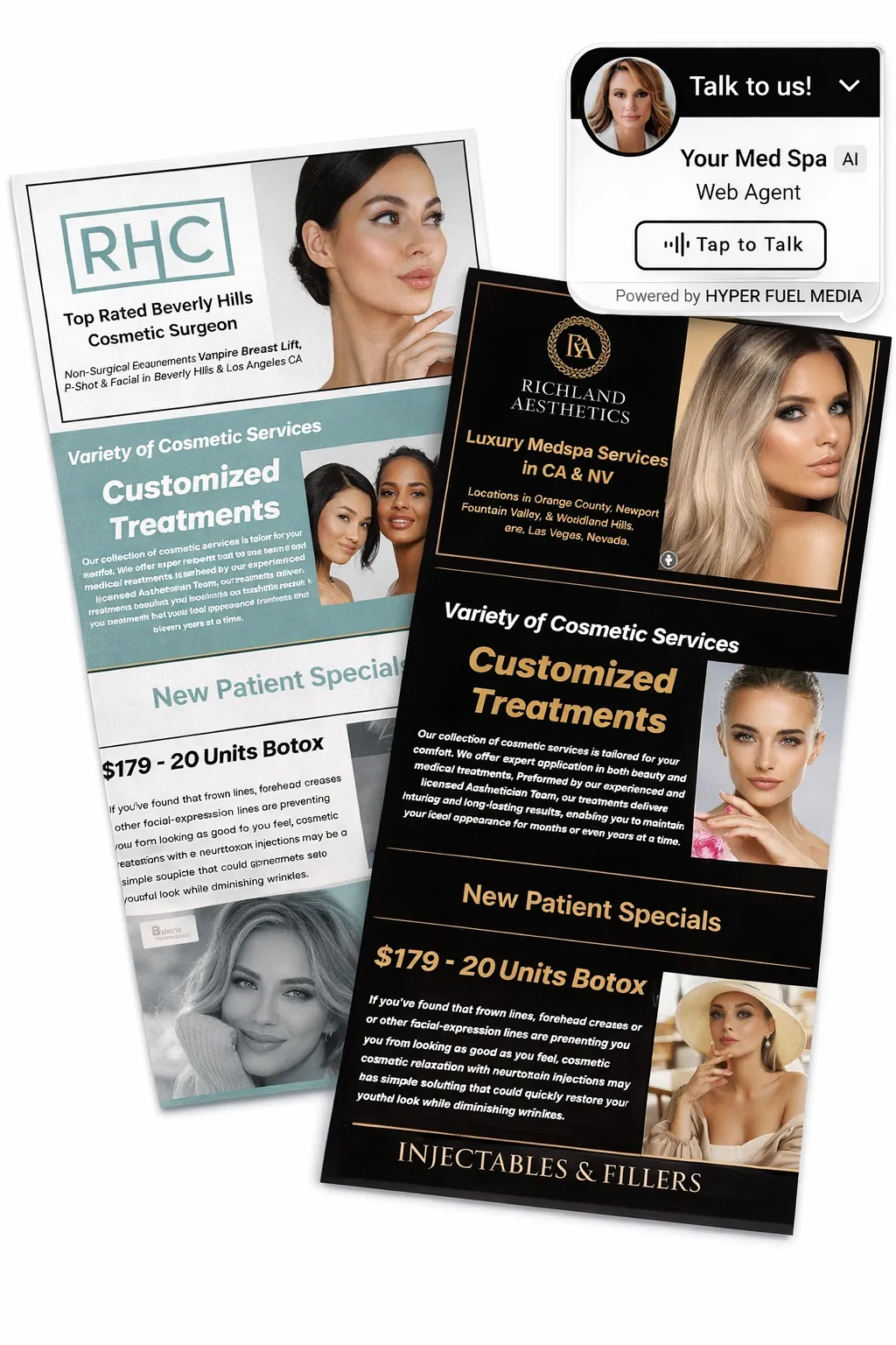 We’ll map out a conversion-focused layout for your Med Spa, show you exactly what information we’d feature (services, specials, reviews, before & afters), and demonstrate how the AI Voice Agent ties it all together. You’ll see a working example and get a clear, transparent quote if you choose to move forward.